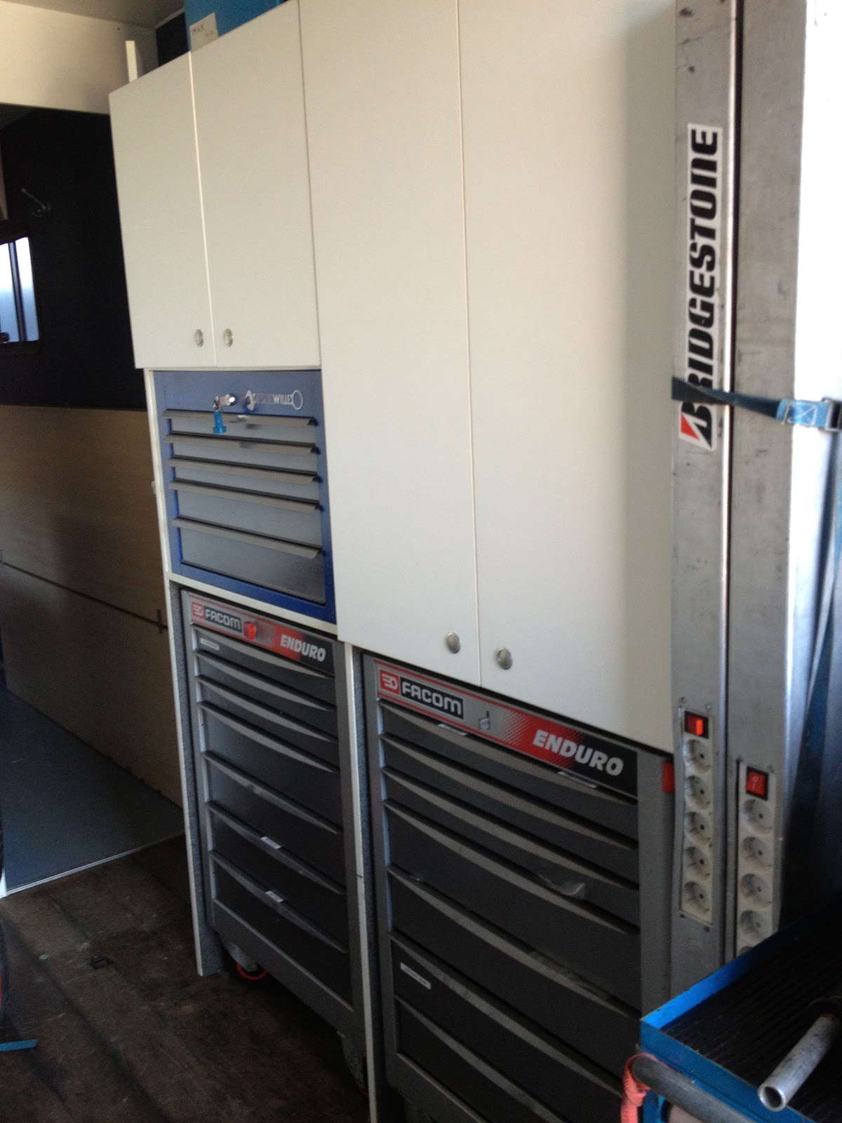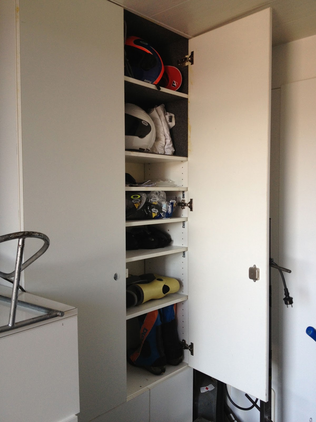Grote ingerichte werkplaats met wandkasten voor reserve onderdelen, bandenrek, speciale kast kleding/helmen/laarzen.